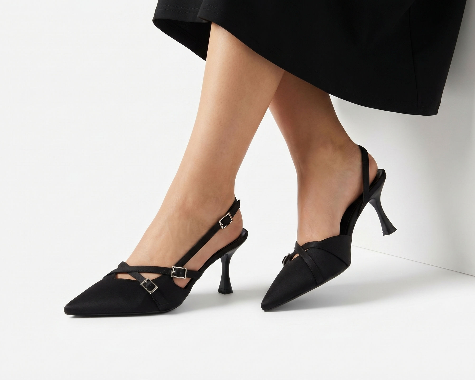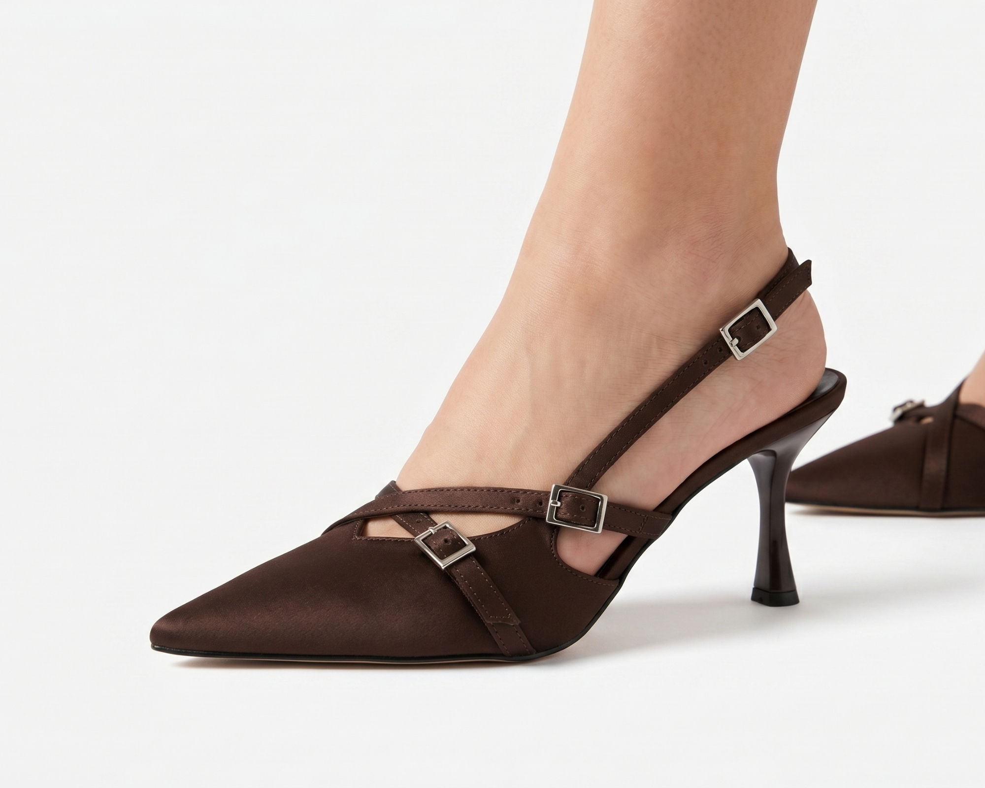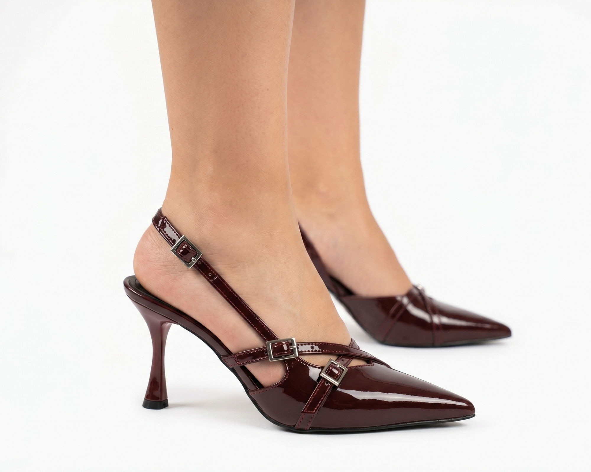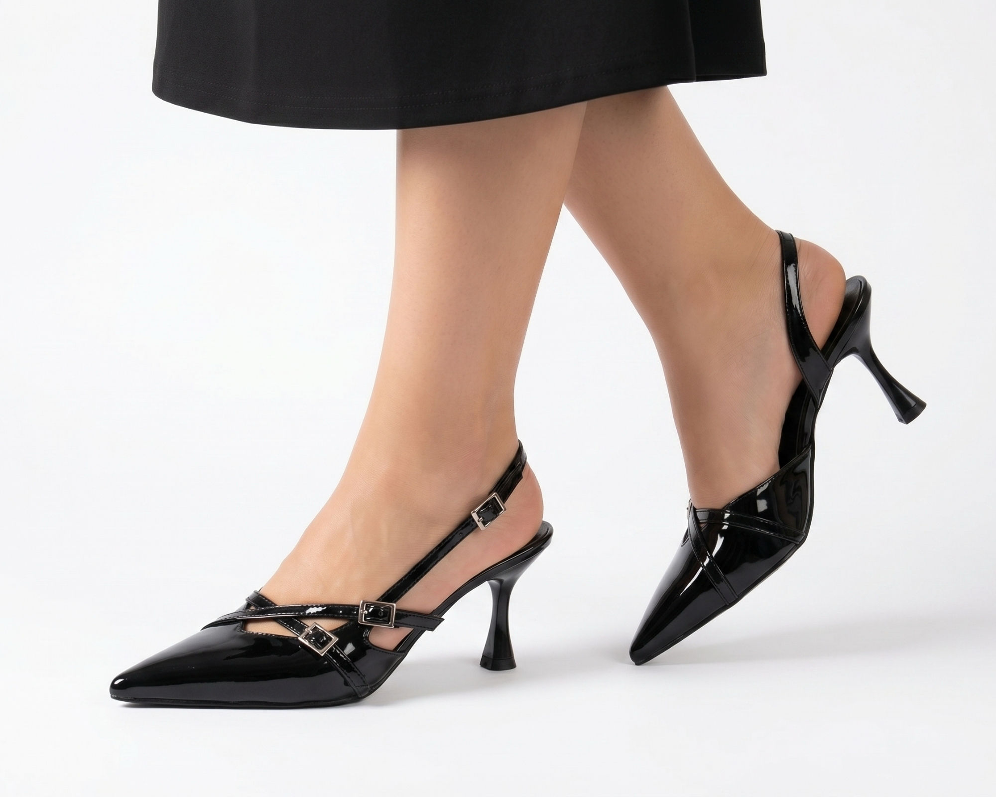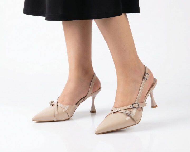 • Zarif Tasarım: Ayak üzerinde estetik bir duruş sergileyen, tokalı çapraz bantlar ve modern slingback (arkası açık) kesim.